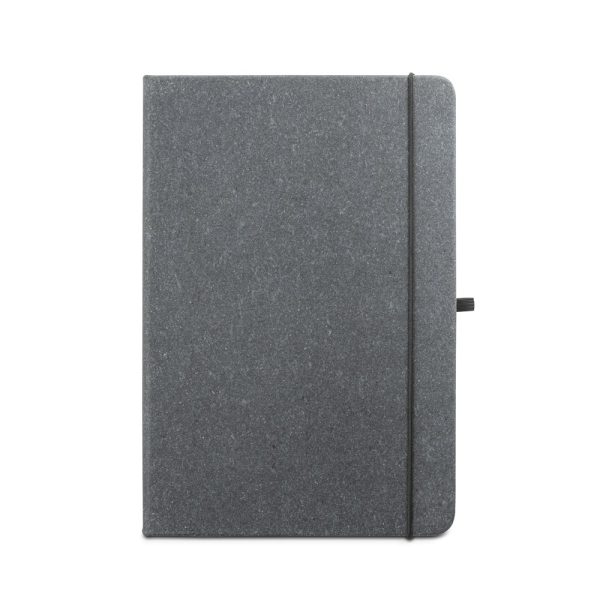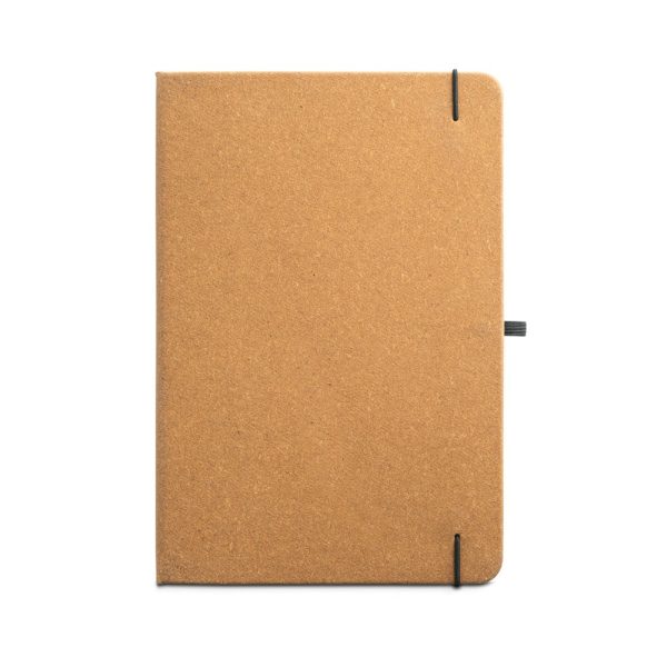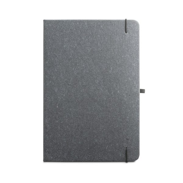 Bloco de notas A5 em pele reciclada com 192 páginas pautadas cor marfim, em papel proveniente de gestão florestal sustentável. Suporte para esferográfica (não incluída), elástico e fita separadora em preto. Contém bolso interior. Fornecido em envelope preto em cartão.