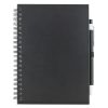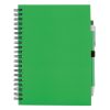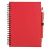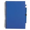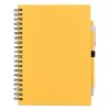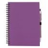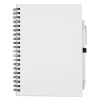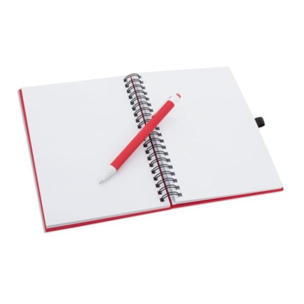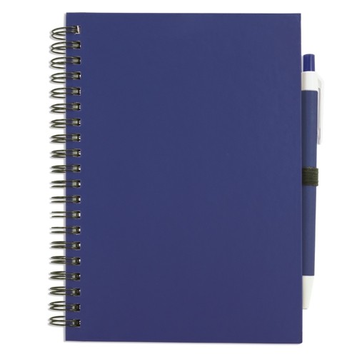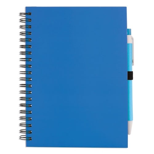 Caderno ecológico de argolas, capa em cartão e forrado a cores brilhantes. Possui um elástico lateral para segurar a esferográfica incluída. Uma bela esferográfica com corpo de papelão e uma cor que combina com o caderno. Interior com 70 folhas em branco liso. Esferográfica escrita azul.