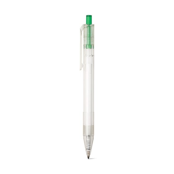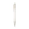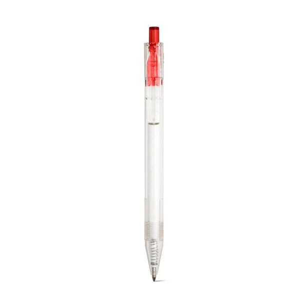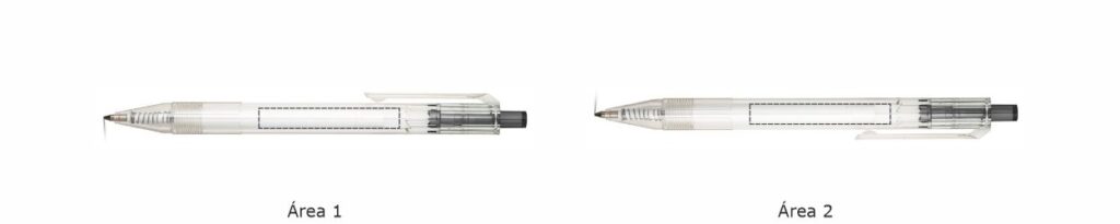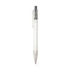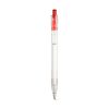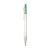 Esferográfica transparente com botão colorido. Escrita a preto.