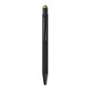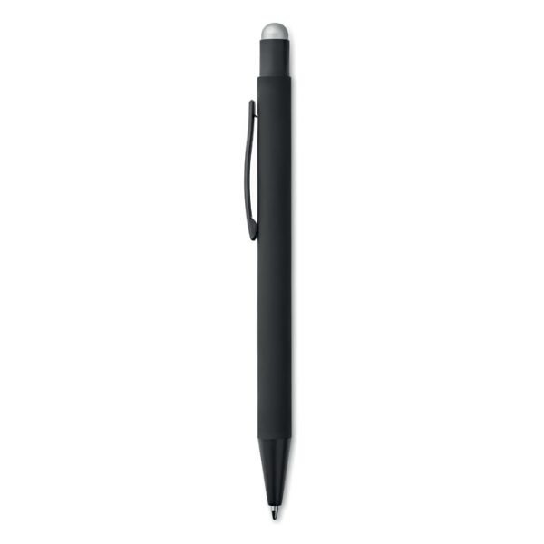 Esferográfica de botão touch em alumínio. Debaixo da capa preta do corpo, é da cor do botão touch, uma vez impresso em laser. Escrita a azul.