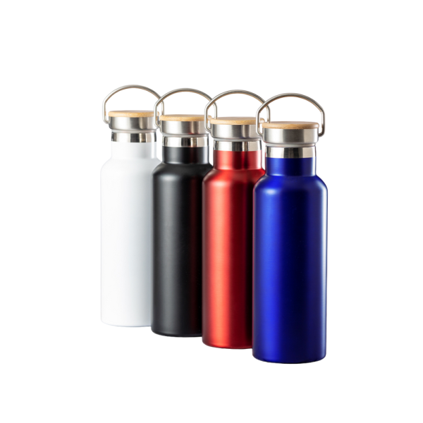 Garrafa térmica de 500 ml de capacidade, fabricada em aço inox de dupla parede. Inclui original tampa de rosca em aço inox, com detalhe de bambu e pega integrada. Disponível numa variada gama de cores e apresentada em caixa individual de design kraft.