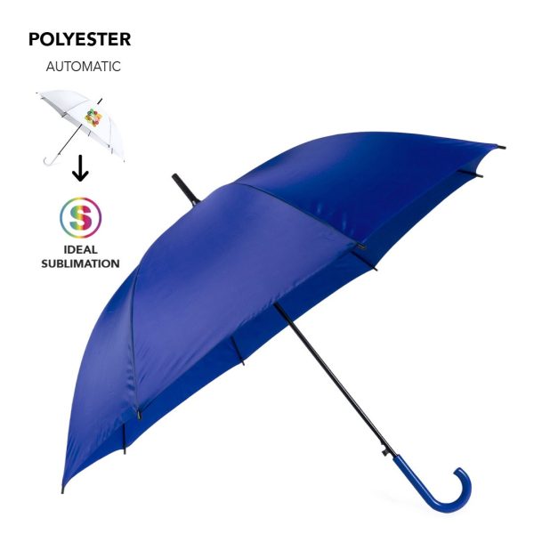 Guarda-chuva de 8 painéis, abertura automática, em material poliéster resistente, com hastes metálicas pretas e alça correspondente.