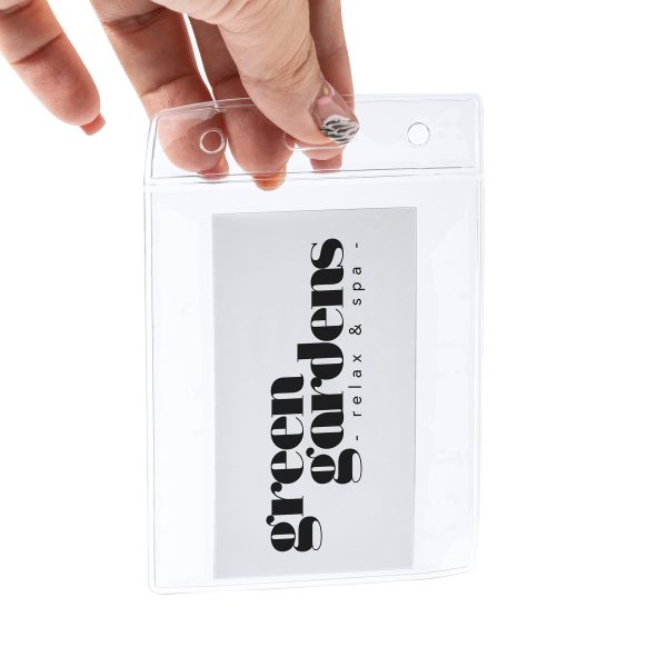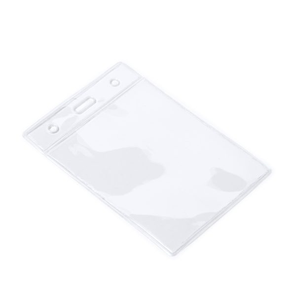 Suporte de emblema de PVC transparente em design vertical.